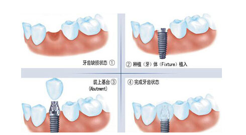 手术开始时先进行局部麻醉,然后植入种植体(人工牙根),然后缝合粘膜。埋入种植体后需要等待1-3个月的时间让种植体和牙槽骨组织结合,才能够完成永久牙冠修复。有人希望可以更美观的话可以采用临时牙冠,完成形态修复。