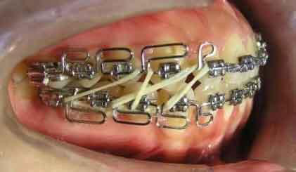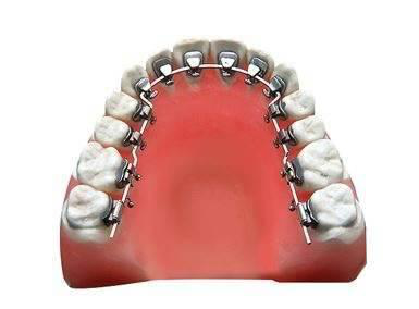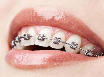 常见的“钢牙”,金属托槽粘在牙齿上,用钢丝固定,慢慢使牙齿移动排齐。