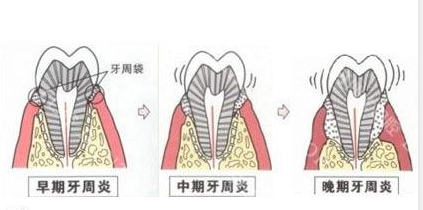 一般到中后期,就会逐渐有牙周袋形成、并且伴有牙周溢脓、口臭。而且由于牙周组织被破坏,特别是牙槽骨吸收加重时,支持牙齿力量不足,出现牙齿松动、移位等现象。